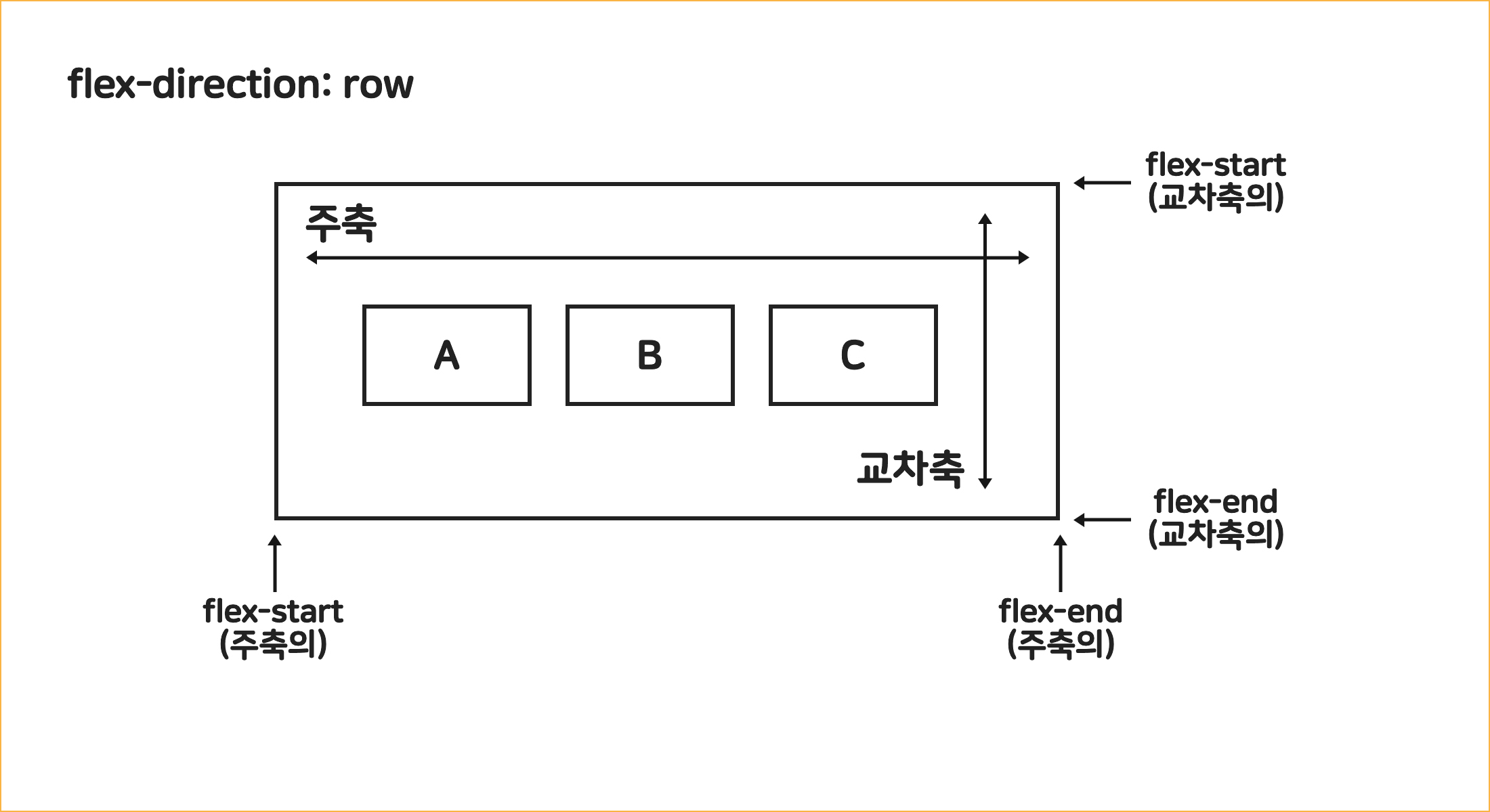 - 상대적 개념 : 주축이 바뀌면 교차축이 바뀜 (flex-direction 방향에 따라서 달라짐)